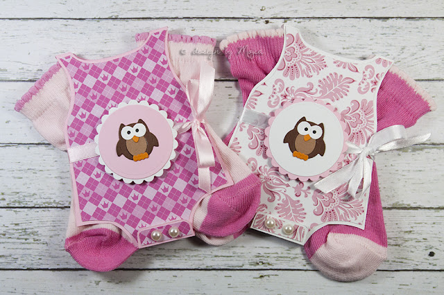 I made this cute little baby bodys with little socks for 1-4 months old children and they are a perfect gift for a newborn. They open on the bottom and you can write a greeting inside, and there are two little socks on each side. Ordinary telegram just doesn't seem interesting once you see this cute little things, doesn't it?